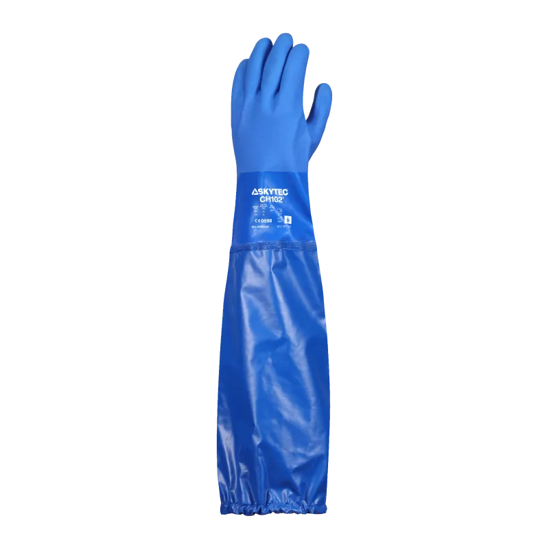 CH102 eru þrítvöfaldir PVC-hanskar sem verndar allan framhandlegginn. Þeir eru sérhannaðir til notkunar í blautu og fitukenndu umhverfi – til dæmis í fiskvinnslu, hreinsun eða efnavinnu. Mjúkt bómullarfóður og saumlaus hönnun tryggja þægindi í langri notkun, og gróft yfirborð veitir mjög gott grip.