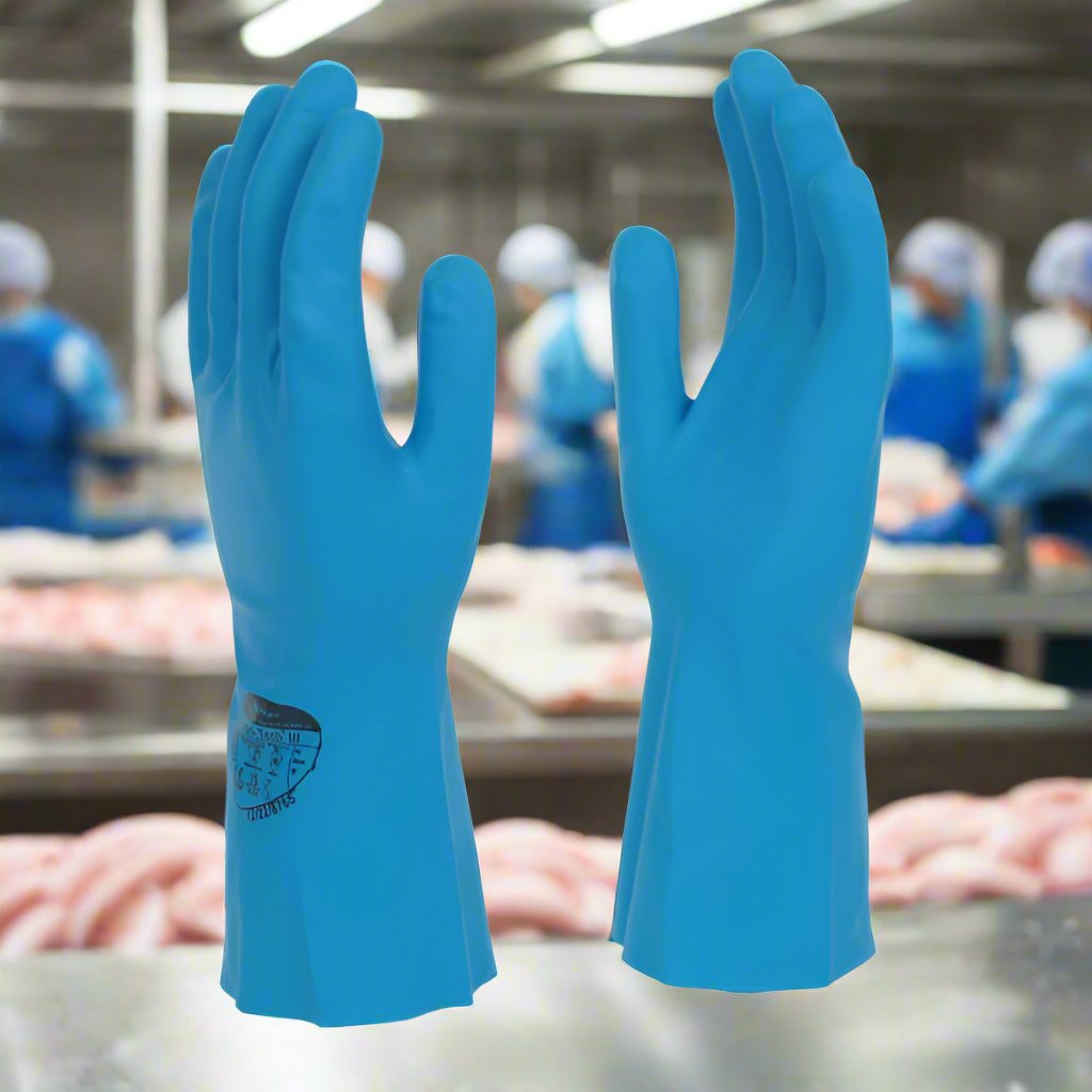 Þeir veita bæði vörn gegn efnum og veirum, auk öryggi í snertingu við matvæli. Nítríl efnasambandið hefur verið fínstillt fyrir efnaþol og hanskinn er með demantsmynstri grip í lófa og á fingrum fyrir betra grip. Nitri-Tech III Blue er blár að lit til að auðvelda auðkenningu í matvælanotkun.